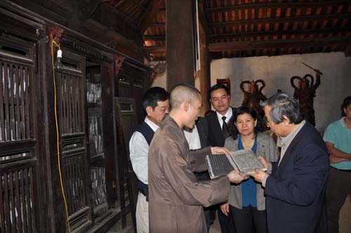 Nhà chùa giới thiệu với du khách về kho Mộc bản Kinh phật. Ảnh TTXTDL
