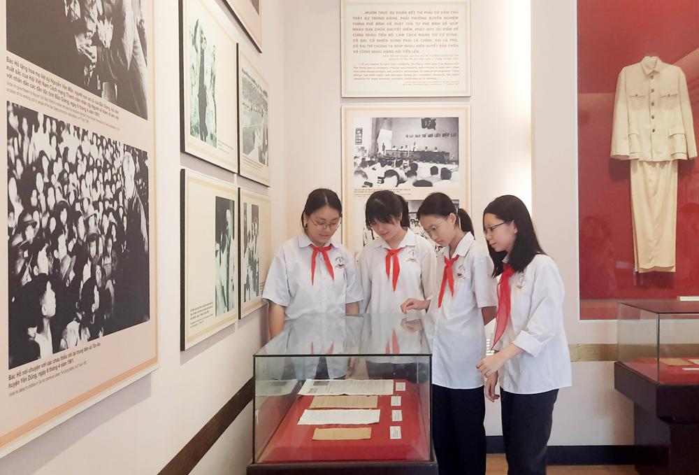 Học sinh TP Bắc Giang tìm hiểu những tư liệu, hình ảnh Bác Hồ khi về thăm tỉnh Bắc Giang, tỉnh Hà Bắc được trưng bày tại Bảo tàng tỉnh. |