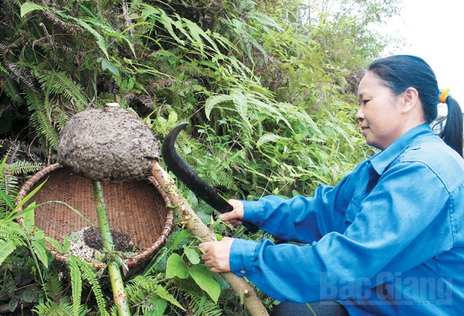 Bà Nguyễn Thị Hợp, thôn Biềng, xã An Lạc (Sơn Động) rũ trứng kiến vào giá. Ảnh: Nguyễn Hưởng