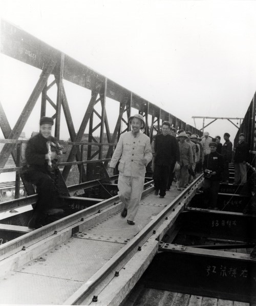 Hồ Chủ tịch thăm công nhân Việt Nam và chuyên gia nước ngoài khắc phục cầu Phủ Lạng Thương (1-1955)( ảnh sưu tầm)