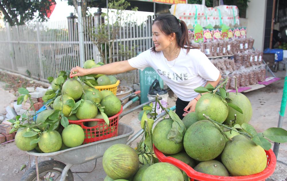 Người dân xã Phượng Sơn bày bán bưởi da xanh. |