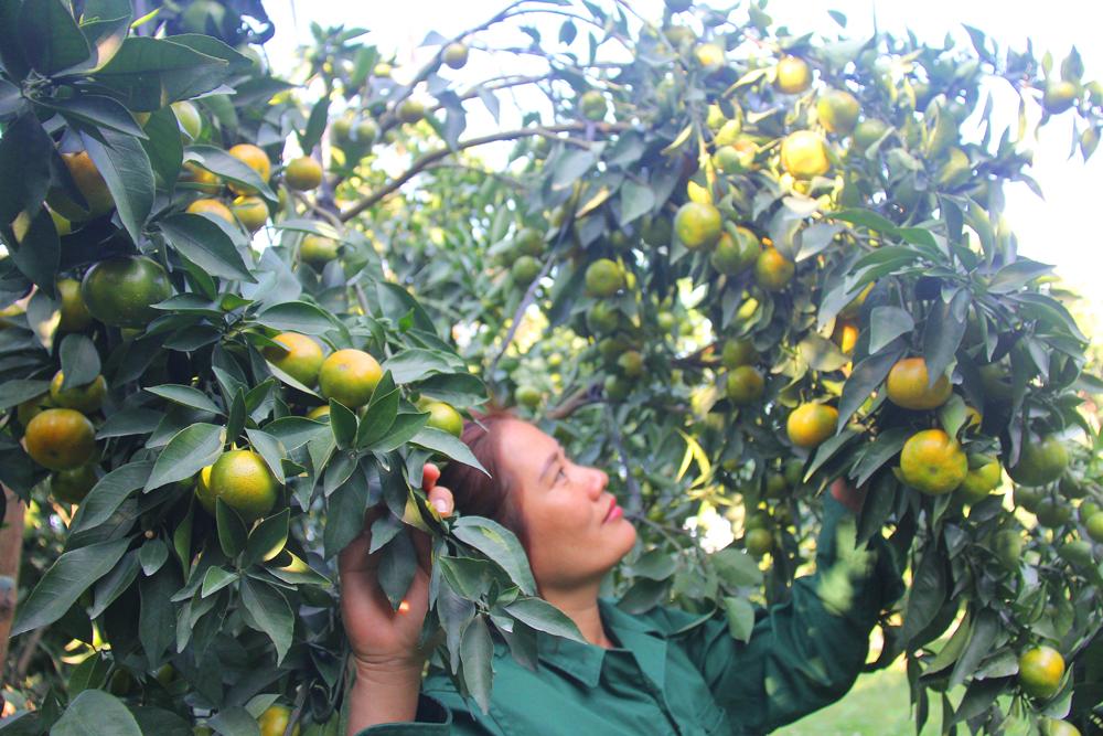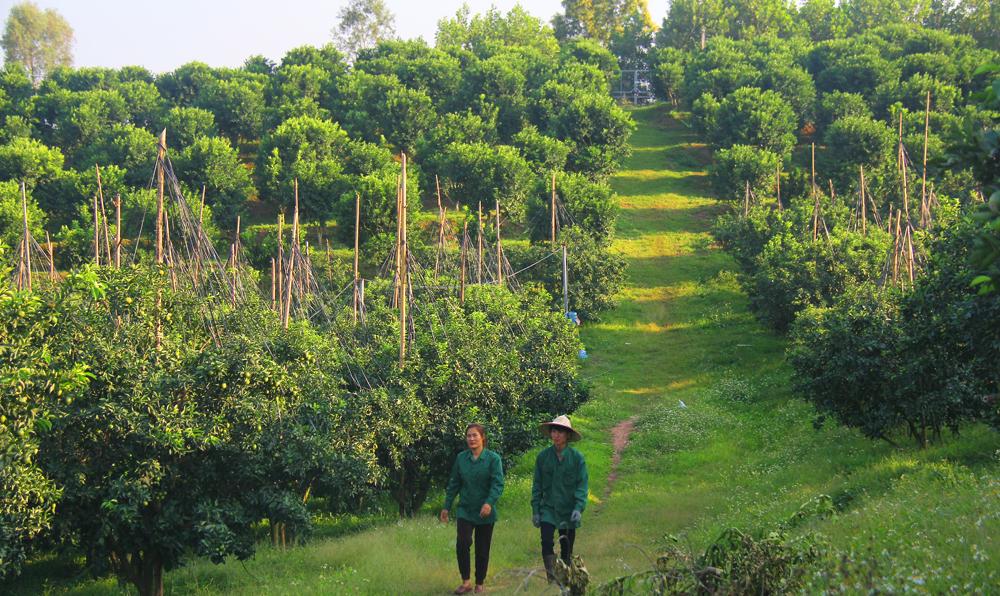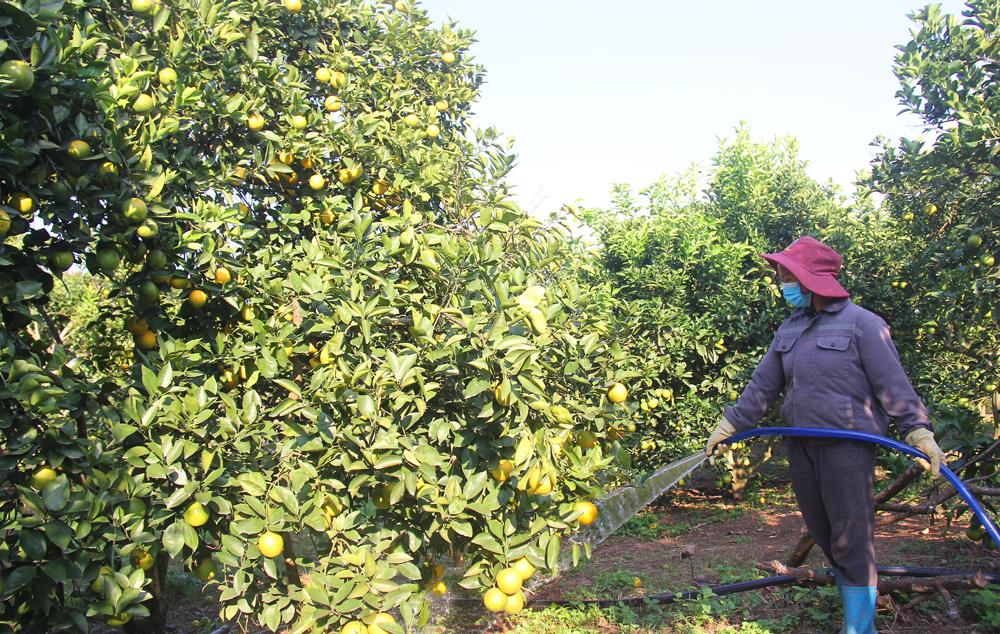 Người dân chăm sóc vườn cam theo hướng hữu cơ. |