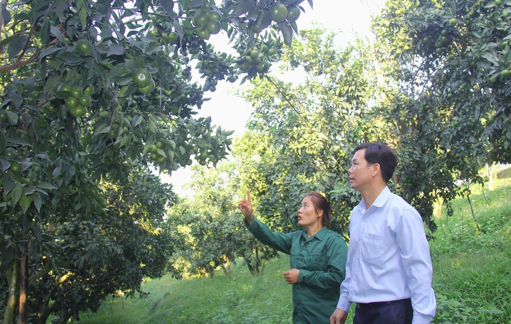 Cán bộ xã Kiên Lao nắm bắt tình hình sản xuất cam, bưởi trên địa bàn. |